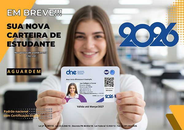 A plataforma Estudante 10.com.br, homologada anualmente pelo PROCON e em conformidade com o Decreto Federal 7.962/13, disponibiliza a ferramenta virtual para as Entidades Estudantis credenciadas pelo Estado da Paraíba e Municípios, garantindo de forma segura, rápida e prática a emisão da Carteirinha de Estudante a você, estudante.
